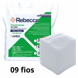 Compressa de gaze 7,5cm x 7,5cm 09 fios c/500 rebecca AméricaCompressa de Gaze 09 Fios 7,5x7,5 Não Estéril com 500 Unidades - Rebecca A compressa de gaze Rebecca é confeccionada em tecido 100% algodão, macio, neutro e de baixa densidade, ideal para procedimentos médicos e cirúrgicos. Com alta absorção e isenta de impurezas, oferece segurança e eficácia em curativos e intervenções. Características: Tecido 100% algodão, alvejado e isento de substâncias químicas nocivas. Dimensões: 7,5 cm x 7,5 cm fechada / 14 cm x 22 cm aberta. Gramatura: 09 fios/cm², com 5 dobras e 8 camadas. Produto não estéril, esterilizável por autoclave, raios gama ou óxido de etileno. Pacote com 500 unidades. Indicações: Absorção de sangue e secreções em cirurgias. Curativos em feridas cirúrgicas e ferimentos leves. Barreira hemostática em procedimentos médicos. Cuidados: Produto descartável e de uso único. Não reprocessar ou utilizar caso a embalagem esteja violada. Conservar em local seco e protegido da luz solar. Garanta a qualidade e segurança em seus procedimentos com a Compressa de Gaze Rebecca.